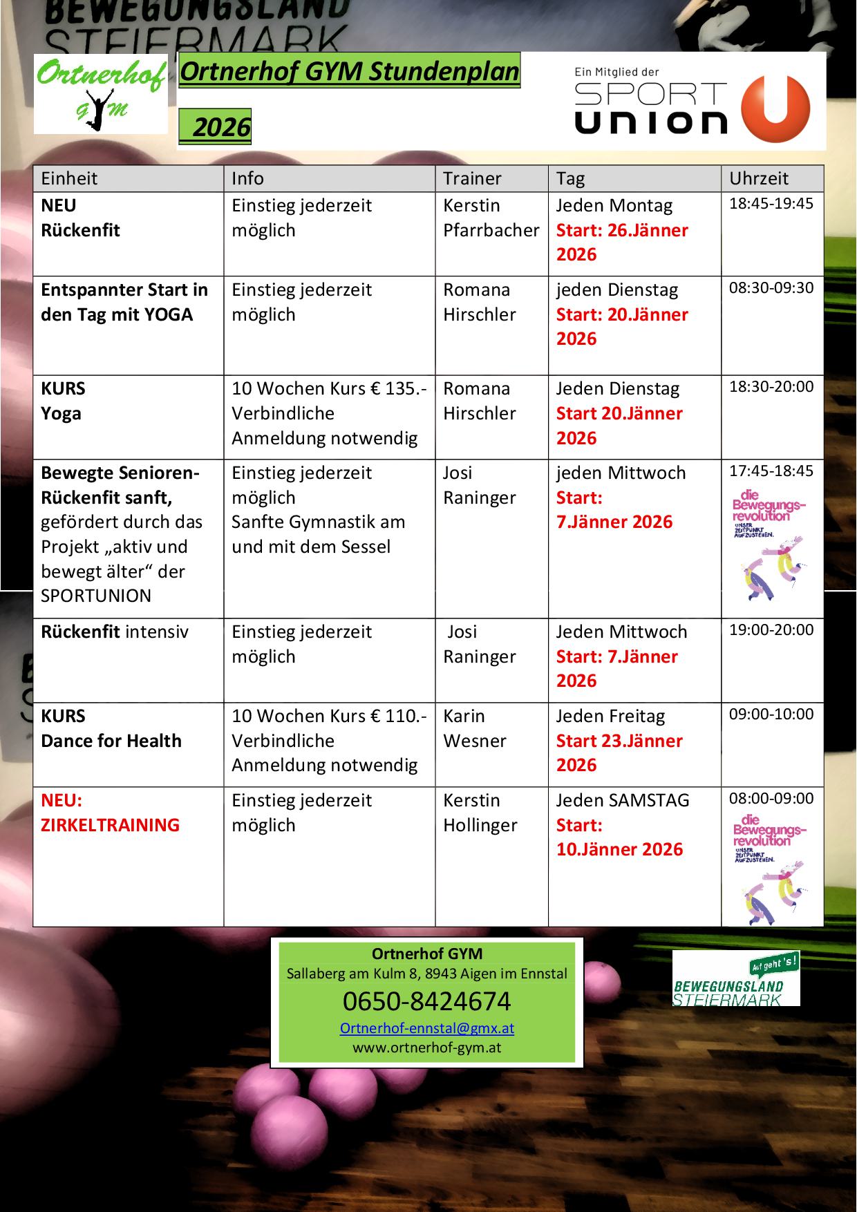Ortnerhof GYM, Josi Raninger, Sallaberg am Kulm 8, 8943 Aigen im Ennstal, Tel: 0650-8424674